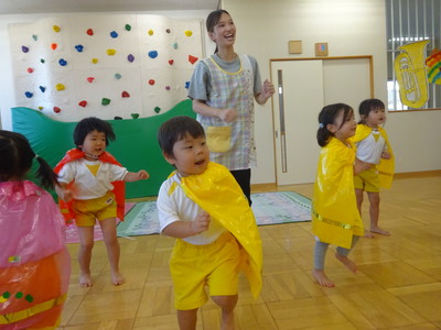 先生と一緒に、アンパンマンと藤田先生がいるゴールを目指してかけっこしました(^^)