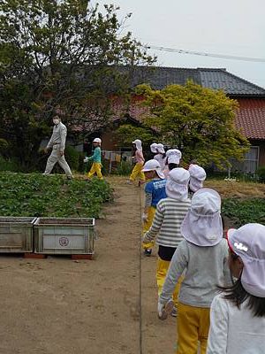 ゆり組さん、今日は園バスに乗って砂子坂の畑に行き、さつまいもの苗を植えました。