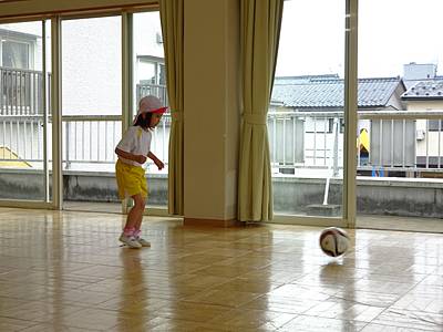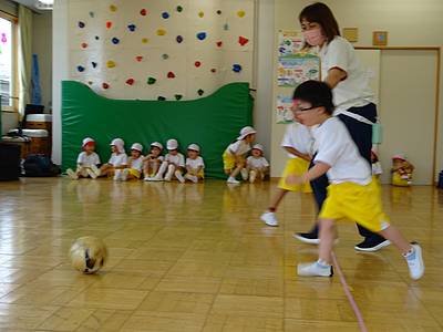 次はボールとお散歩です♪“ちょんちょん”と足でボールを蹴りながら進みます。『ドリブル』という名前も教えてもらいました。時々、ボールの方が先に進んでしまい「あ~まって~!」と追いかけます。