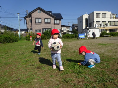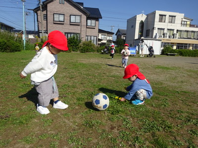 持って遊ぶだけでなく、上手に蹴って転がします。