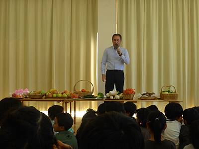 果物やお野菜をくださった神様の恵みに感謝して、お祈りをしたり賛美歌を歌ったり、山本副園長先生のお話を聞いたりしました。
