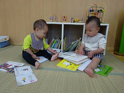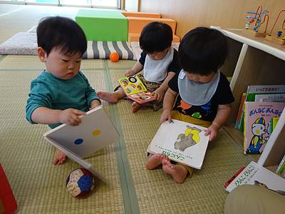 本棚から絵本をたくさん出し、その中から好きな絵本を見つけると…