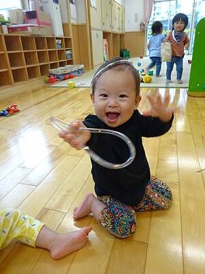 最近は頭にのせて落とす事が好きで、先生が「おっとっと…」と落として見せると、大笑いしているぽかぽかさんです!(^^)!
