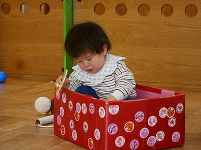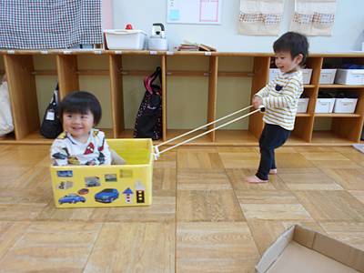 この狭い空間が落ち着くようで、箱の中で好きな遊びを楽しんだり、お友達を乗せて引っ張ったり…