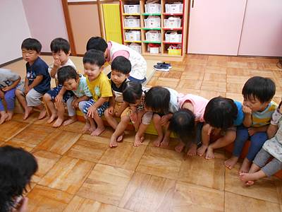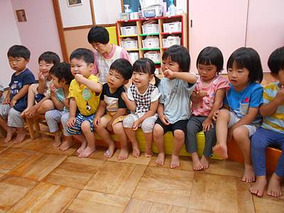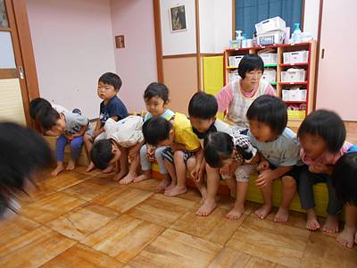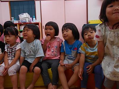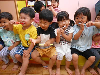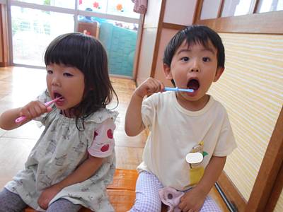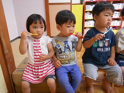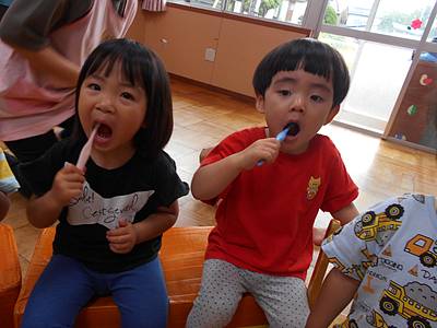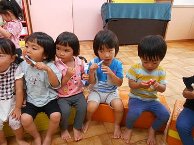紙芝居が終わったら実際に自分で歯を磨いてみます。
