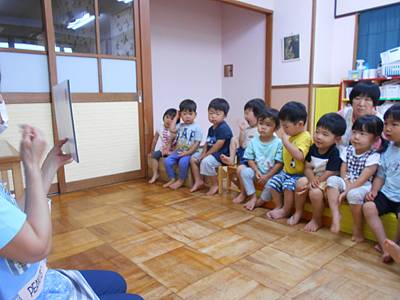 「ワーニー はみがきできるかな」の紙芝居をじっと見ています(^^)