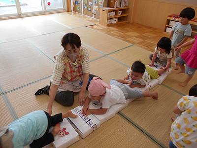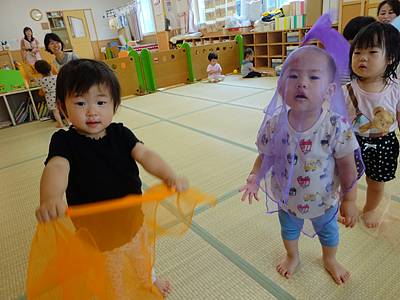 あたまからかぶったり、♪ぐるぐるヘリコプターの曲に合わせて