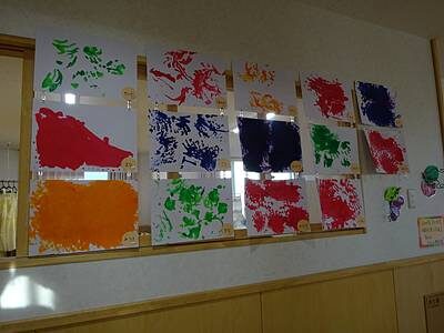 手に絵の具をつけて、画用紙に思い思いに色を重ねていきました!