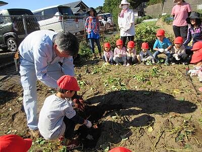 芋の周りを丁寧に掘ってから引っ張る様子をみせてもらいました。