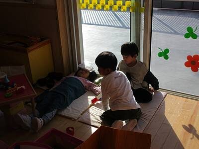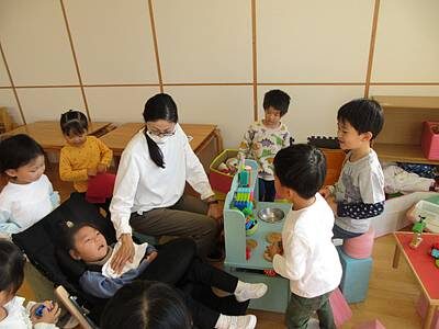 お部屋では「今日はどうされましたか~」「ちょっとお熱がでて、、」「入院して手術が必要です!」と病院ごっこが盛り上がっています!