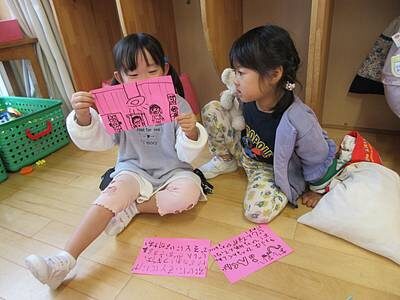 保育園ごっこでは、小さな保育士さんたちが手作りの紙芝居を読んだり、ぬいぐるみを持ちながらいつもみんなでやっている手遊びをしたりしています💞