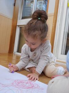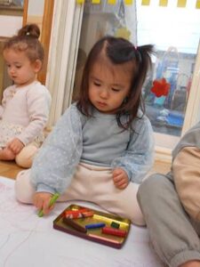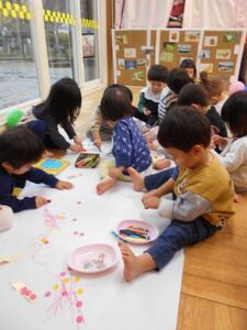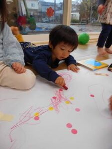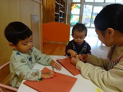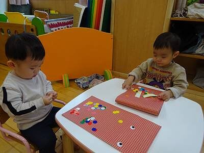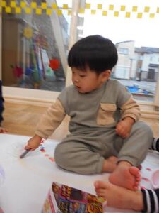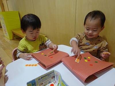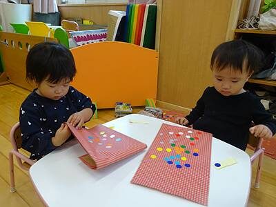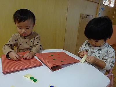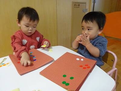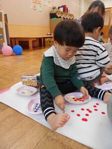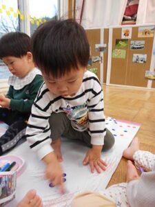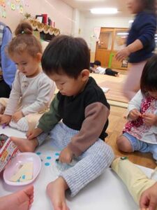 指先が器用になり自分ではがして貼る子。先生からシールをもらって、小さなお手々で、もみくちゃにしながらも貼る子