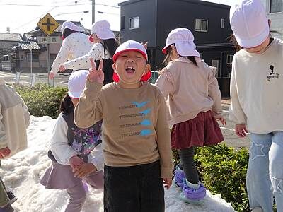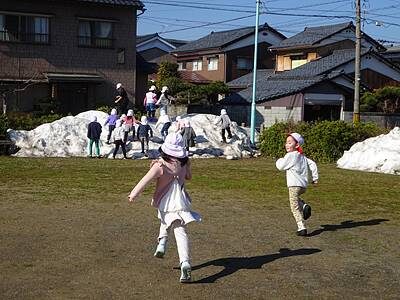 日光公園で大きな雪山を見つけた子ども達は、「わぁーーっ✨」と大喜びで雪山に向かって一直線です!