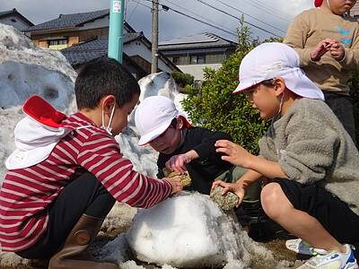 雪の塊を石で削っているAくん。大根おろし…ではなくて、『雪おろし』だそうです(#^^#)