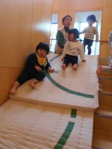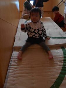 最近は階段を滑り台に変身させたり廊下にお山を作ったりして遊んでいます(^^)/