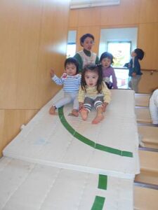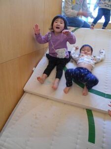 前向きでゆっくり進んだり、うつ伏せになり手でマットを押しながら勢いよく滑り降りたり!