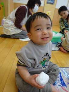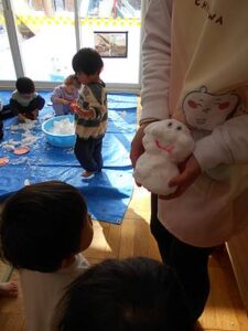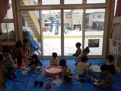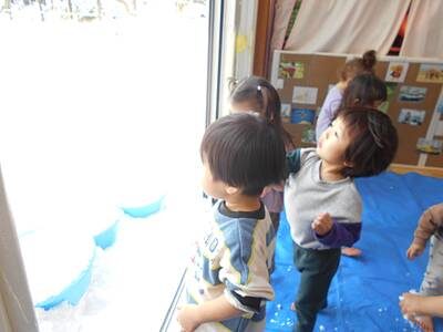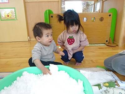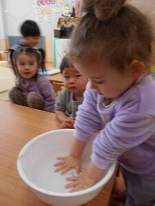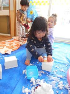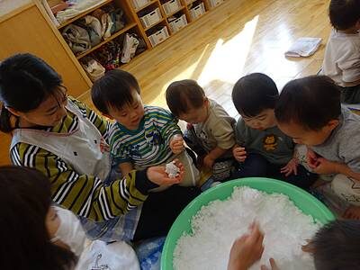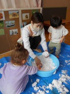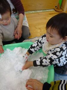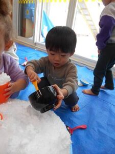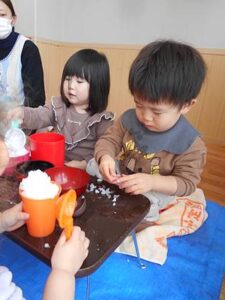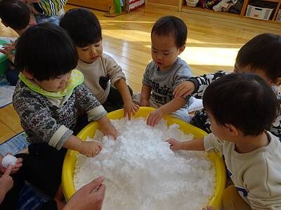 たらいを置いた瞬間に、タライの雪にお手々が伸びます。まずは感触を楽しむ子どもたちです。