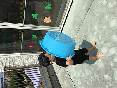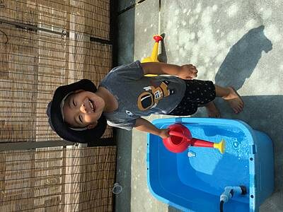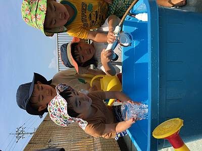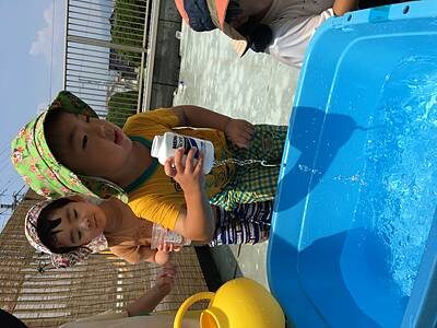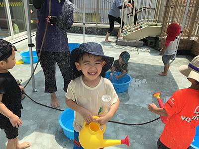 たらいの水をじょうろに入れたりバケツにくんだりして楽しんでいる子や、先生に「シャワーして!」と声をかけて全身で水遊びを楽しんでいる子など、それぞれに遊び方を考えていましたよ!