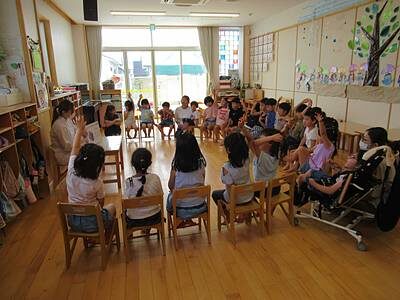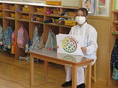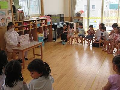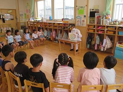 今日のゆり組さんは、いつもおいしい給食を作ってくださるメフォスさんから、栄養バランスについて大切なお話を聞きました。