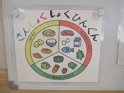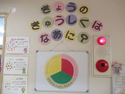 明日からはゆり組のグループお当番さんが、その日食べた給食の食材を3色の栄養バランスボードに色ごとにわけて貼っていきます。