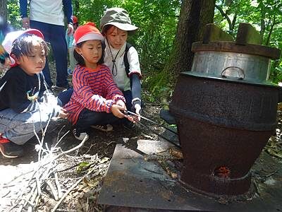 「折った時に“パキッ”と音がする枝がよく燃える枝だよ」と教えてもらい、選びながら集めます。