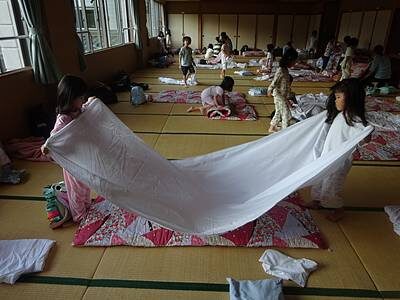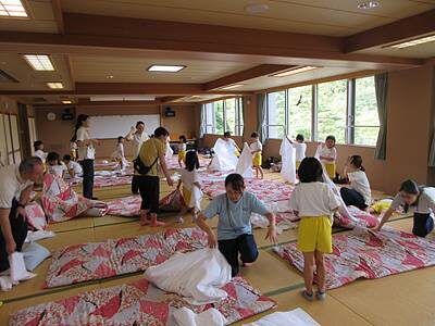 そして、いよいよ自分たちで布団敷きをします。