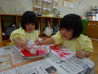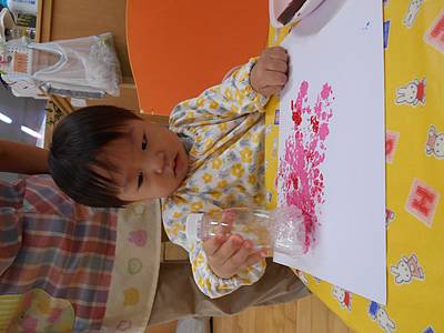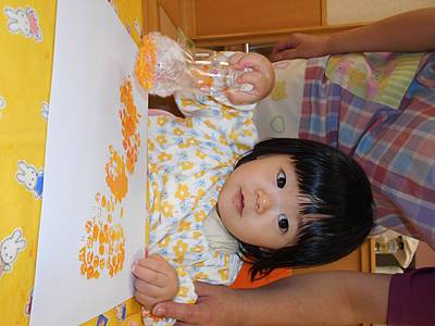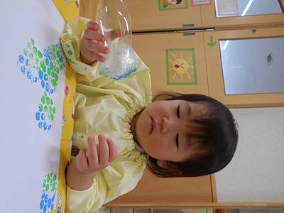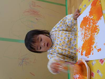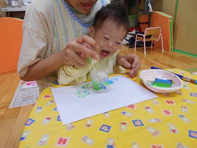 最初は、絵の具が手に付く感触が怖くて先生と一緒にトントンしていた子も、スタンプをしているうちに楽しくなってきて・・・