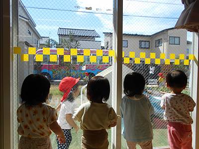 少しずつ涼しくなってきてお外で遊んでいるお友だちに「わ~!」と挨拶をしたり、先生が「バス来たよ!」というと