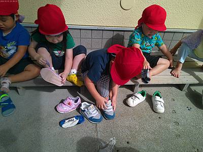 帽子をかぶって、くつを履いて……