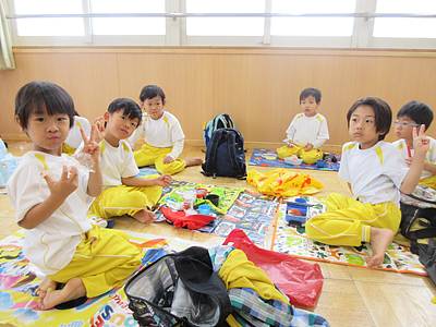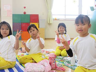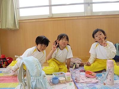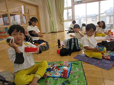 肌寒かったのでお弁当は園に帰ってからホールに集まって食べました。