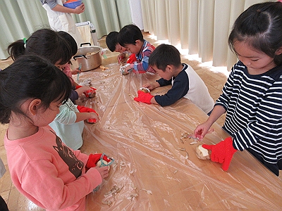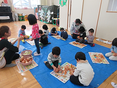 ちゅうりっぷ組さんは玉ねぎの皮むきです。指でつまんでそっとむいていきます。皮が小さくちぎれるから難しいね。