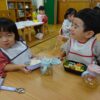 もうすぐ光の子バザールです。光の子バザールは、全園児が参加するおみせやさんごっこです。2歳児のたんぽぽさんもお店で売る「こま」を作りました。初めてはさみで色画用紙を切って、紙皿に貼り、ペットボトルのキャップを上と下にくっつけて、はい!できあがり。たんぽぽさんをのぞいたら、「せんせー、ほら!」「○ちゃんつくったの、かってもいいよ~」と見せてくれました。小さな手で一生懸命回して笑顔いっぱいのたんぽぽさんでした。光の子バザールが楽しみですね。